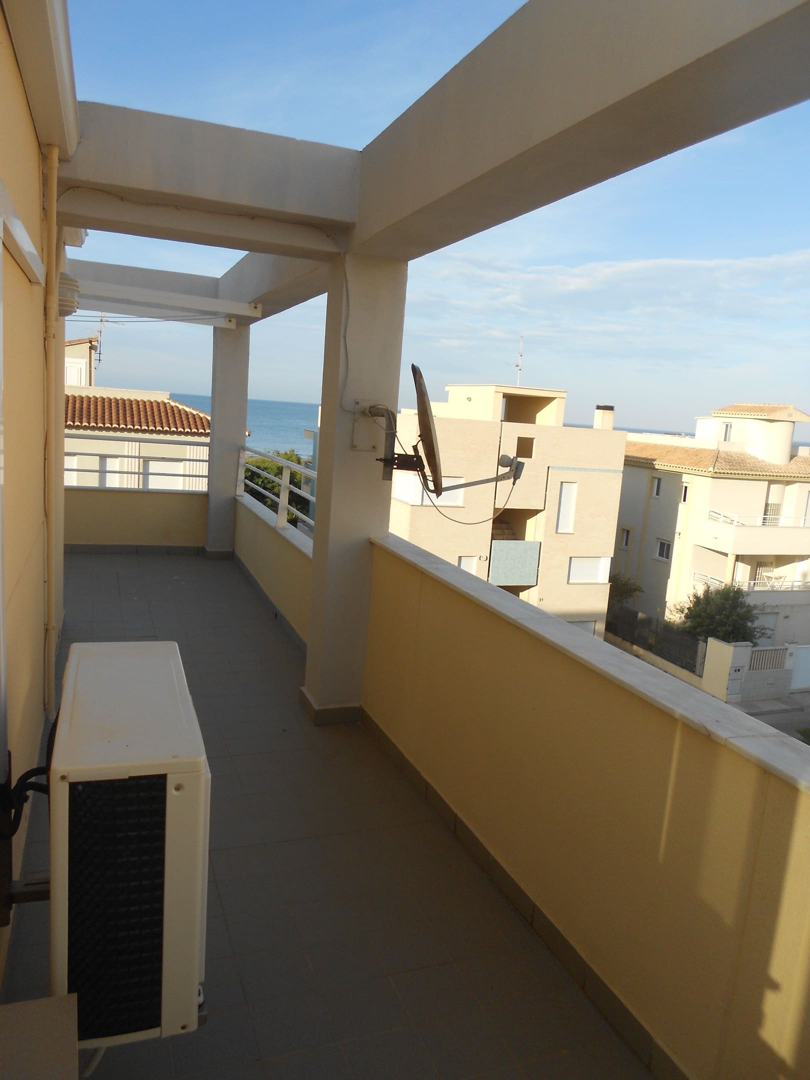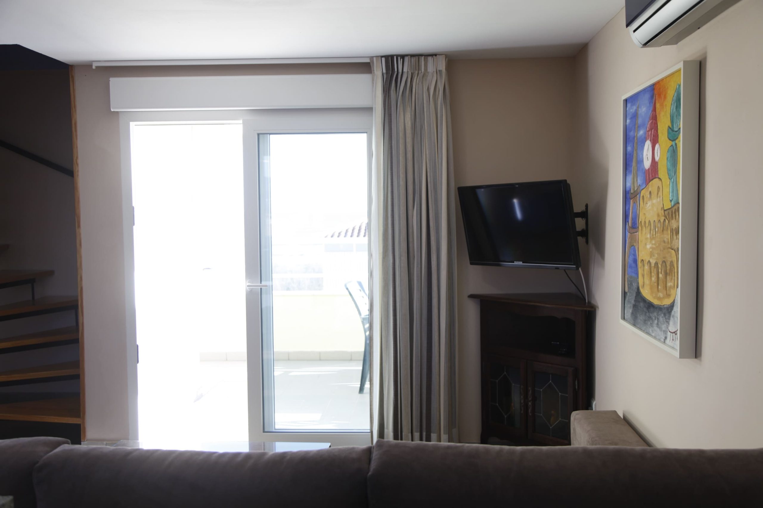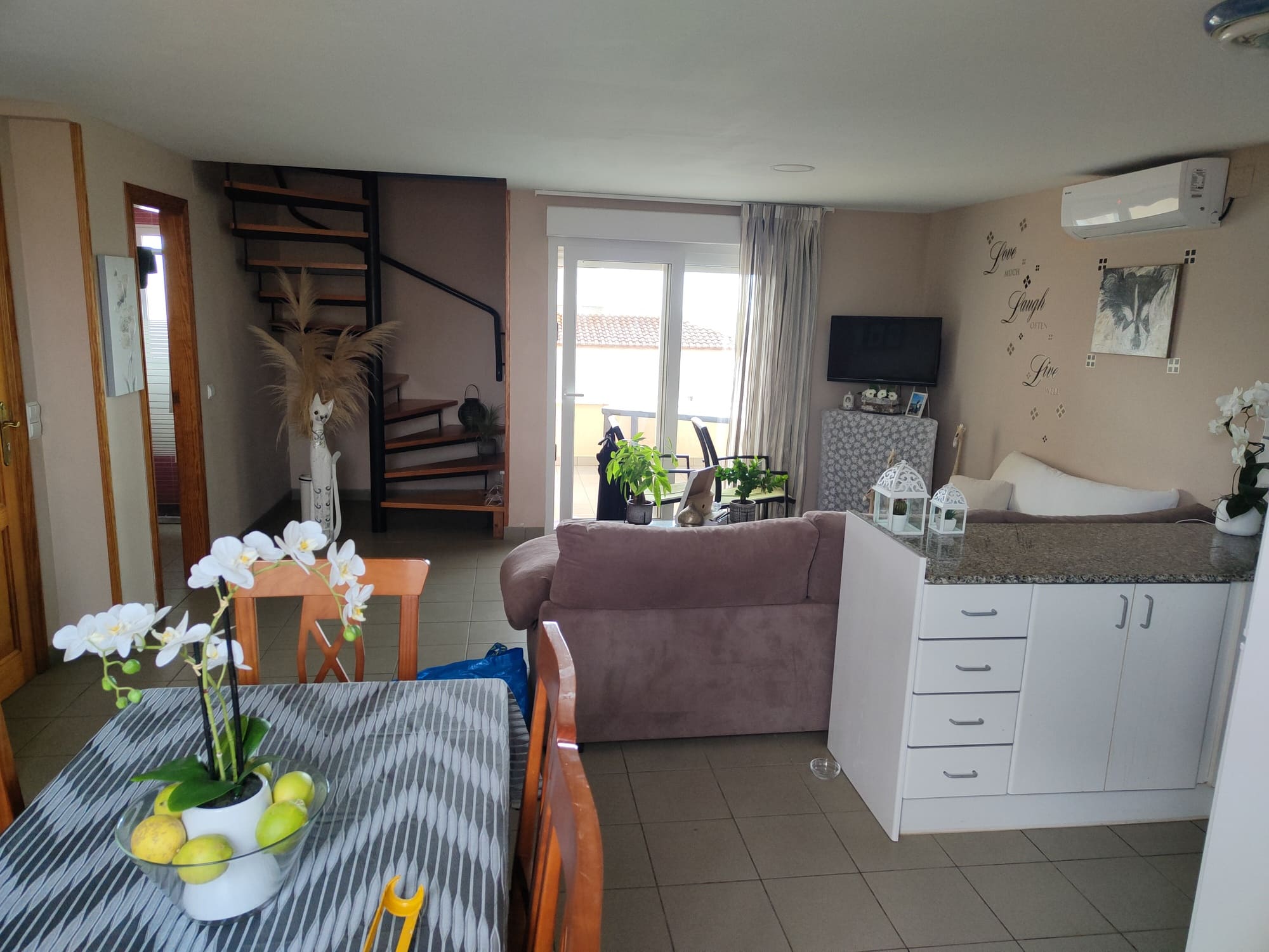 Ático dúplex de 2 plantas: en la de abajo cocina comedor, cuarto de baño y una gran terraza con vistas al mar y a la montaña que rodea todo el apartamento. En la de arriba tiene 3 habitaciones (una hab. de matrimonio, una cama de 105 cm y otra con una cama nido) y otro baño.